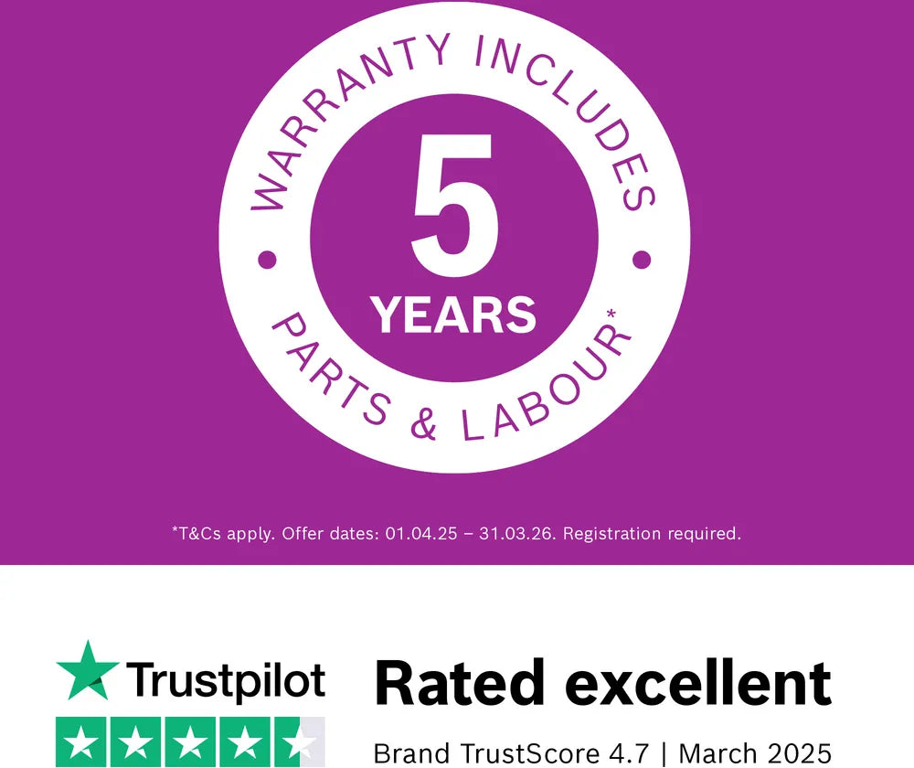 | Warranty Redemption Information | *The 5 year Warranty needs to be registered within 3 month of purchase date. Either call Bosch customer service team on 0344 892 8979 or register online at bosch-home.co.uk |
