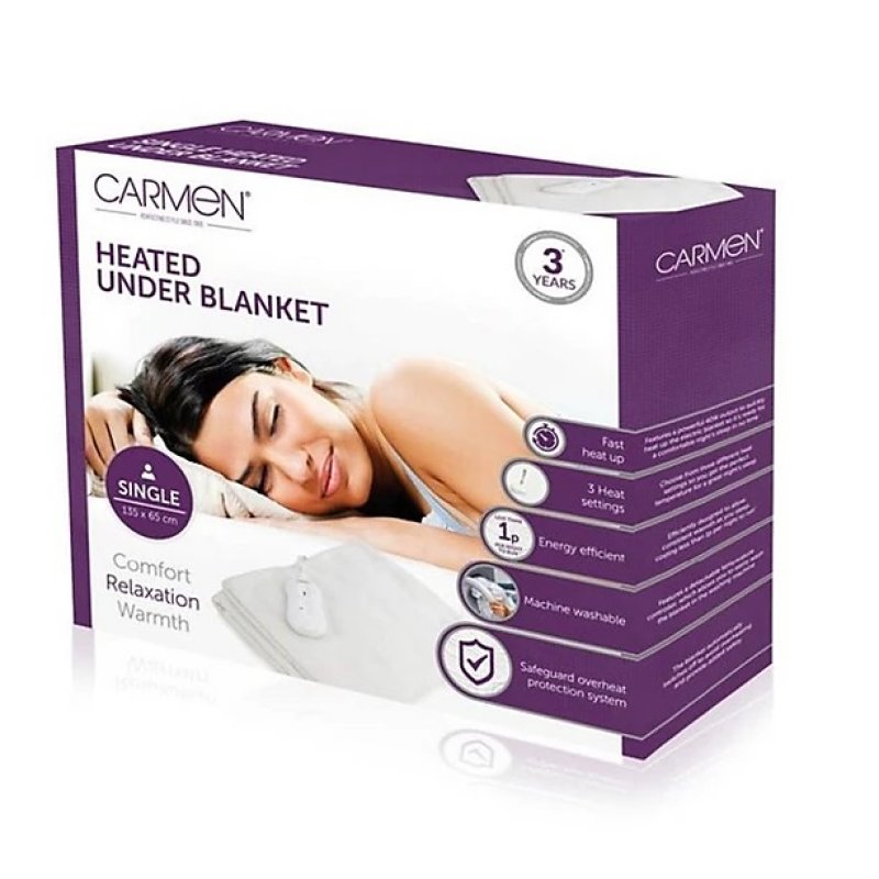Experience a cozy, restful sleep with the Carmen C81189 Single Fitted Underblanket. Featuring an extra-plush 40-cm skirt and overheat protection, this electric blanket ensures secure warmth throughout the night. Enjoy the perfect night's sleep without the worry of overheating.