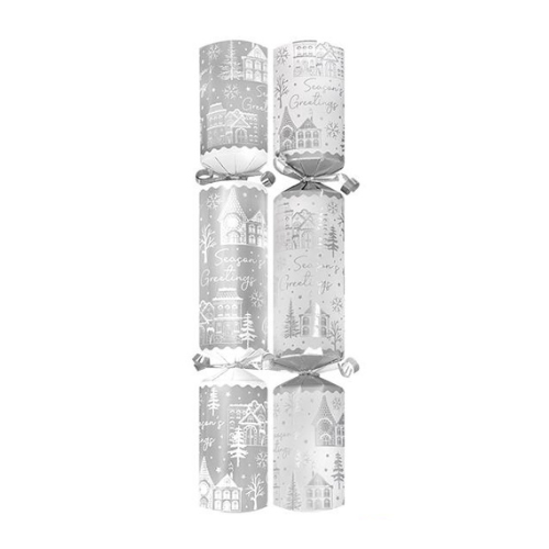 Bring festive magic to your Christmas table with these stunning 10 Family Silver Houses crackers. Each 12" cracker features a charming miniature house design finished in elegant silver, creating a captivating centrepiece that delights guests before the meal even begins. Pull the crackers to reveal traditional surprises inside—perfect for sparking laughter and conversation around the dinner table. Ideal for families and gatherings of up to ten, these premium crackers combine visual appeal with timeless Christmas tradition. Make your holiday celebration unforgettable with crackers that deliver both spectacle and joy.