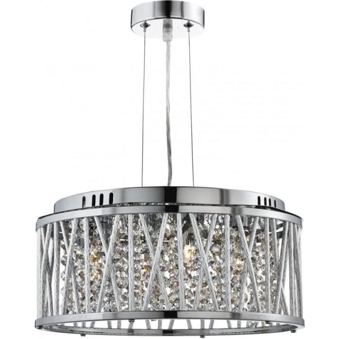 This Elise Chrome 4 Light Fitting with Crystal Button Drops and Aluminium Tubes Trim makes a bold centrepiece for any bedroom, living room, dining room or kitchen. The circular chrome finish fitting has aluminium tubes in a criss-cross and straight lined pattern around the outside. And the centre of the fitting is adorned with clear crystal button drops, which sparkle beautifully when the lights turn on. The wire suspension can be adjusted for different ceiling heights.