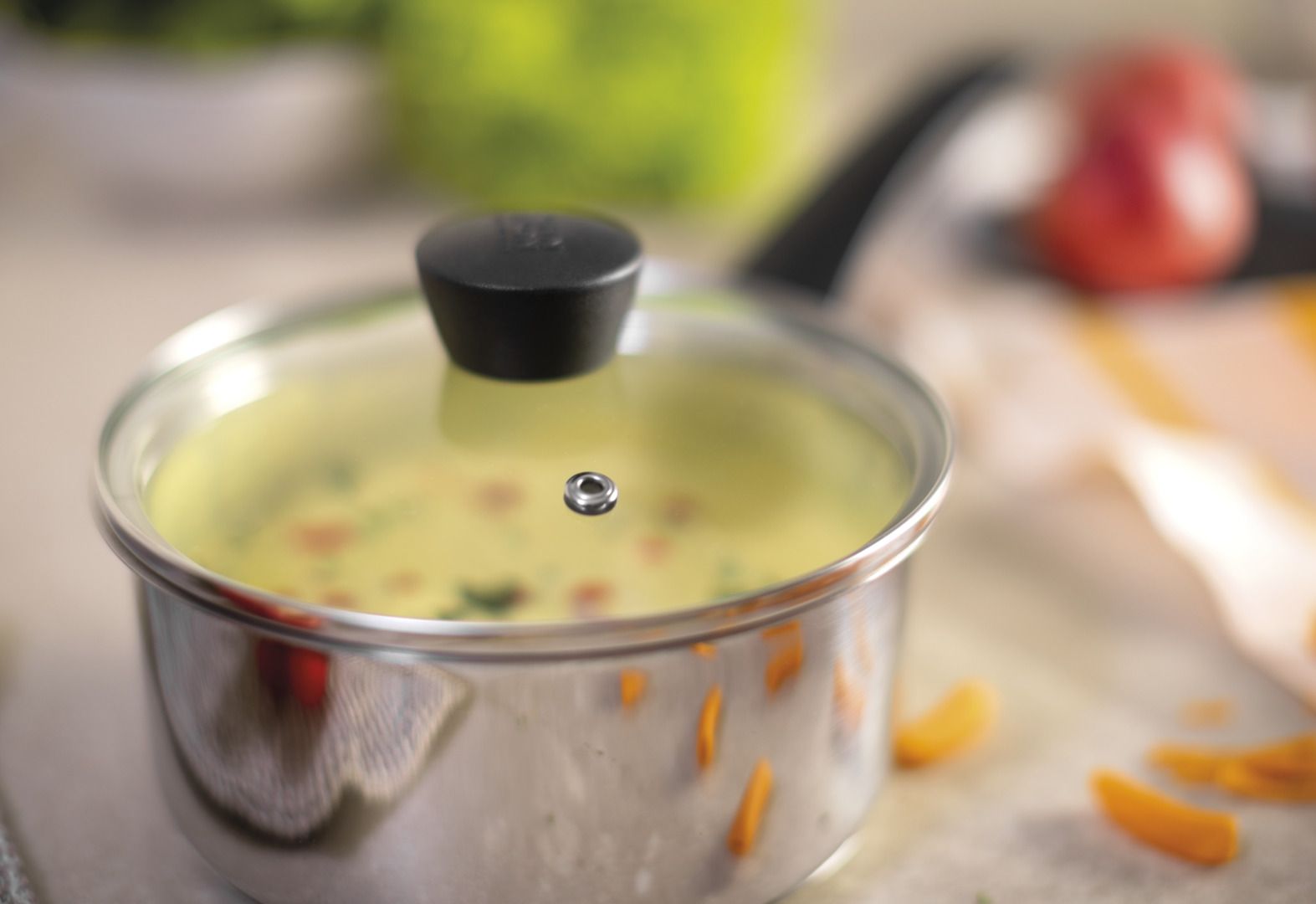 - Vented ovenproof glass lid with stainless steel rim and handle