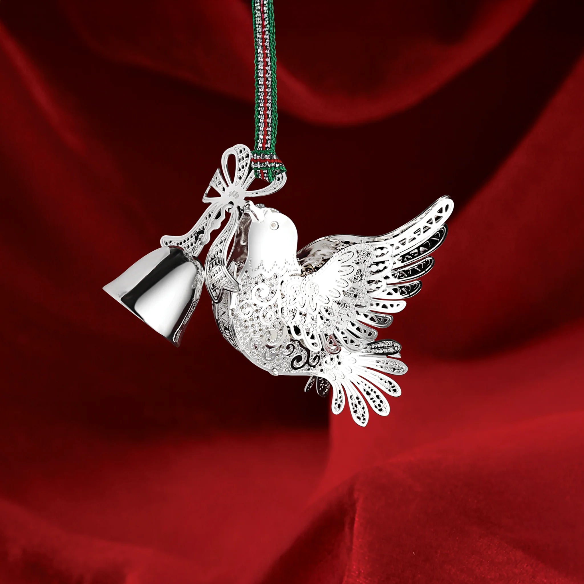 This striking three-dimensional ornament showcases a beautifully detailed Dove perched alongside a finely crafted bell and bow. Celebrate the season by gifting this elegant silver-plated Christmas tree decoration from Newbridge Silverware, adding a touch of festive charm to any home.