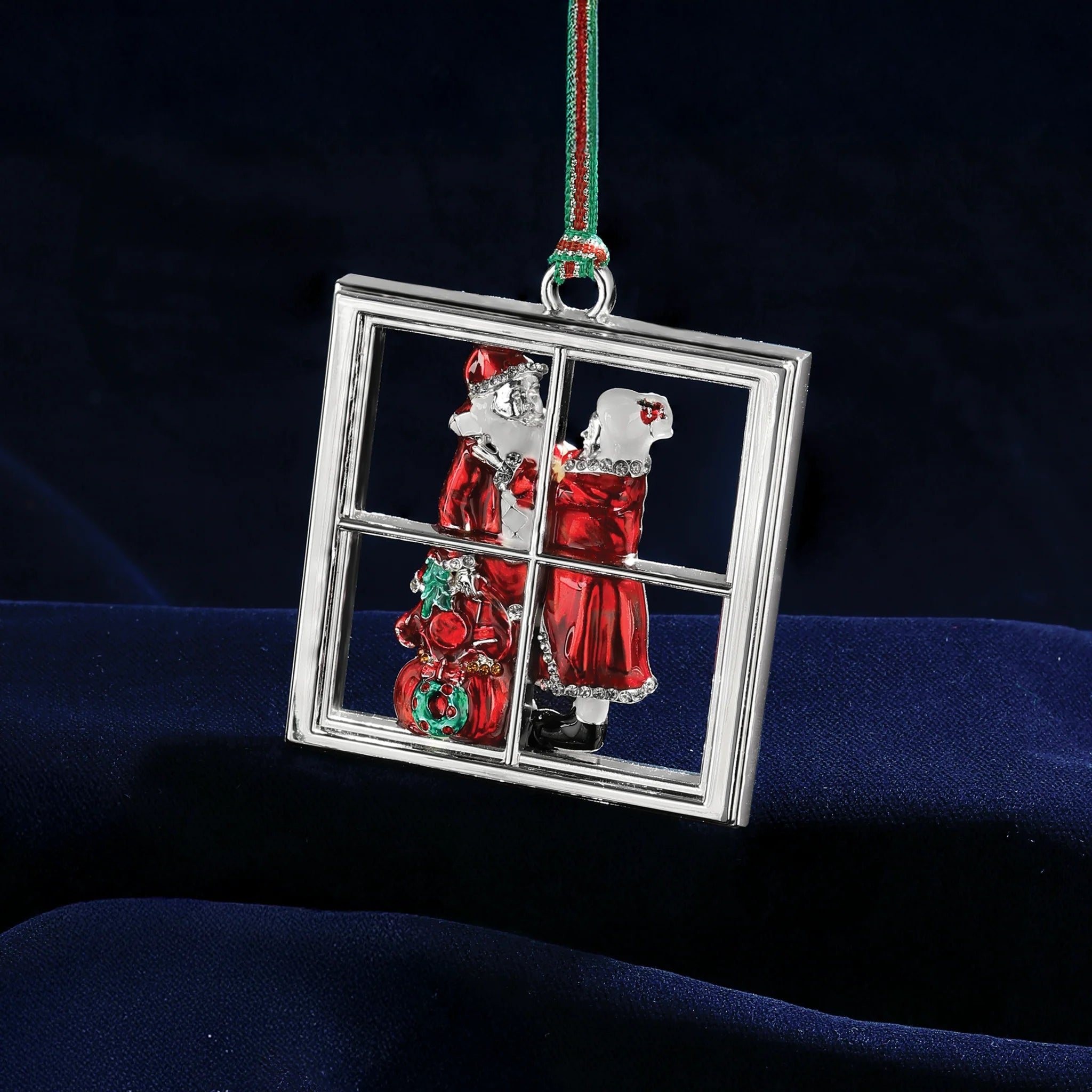 Capture the spirit of Christmas with this silver-plated Santa Leaving North Pole tree decoration by Newbridge Silverware. Showcasing a charming window scene where Mr. Claus bids farewell to Santa on his worldwide Christmas Eve adventure, this ornament brings the enchantment and joy of childhood holiday dreams to life. It's a delightful, heartwarming gift that will bring a touch of playful festive magic to your holiday decorations.
