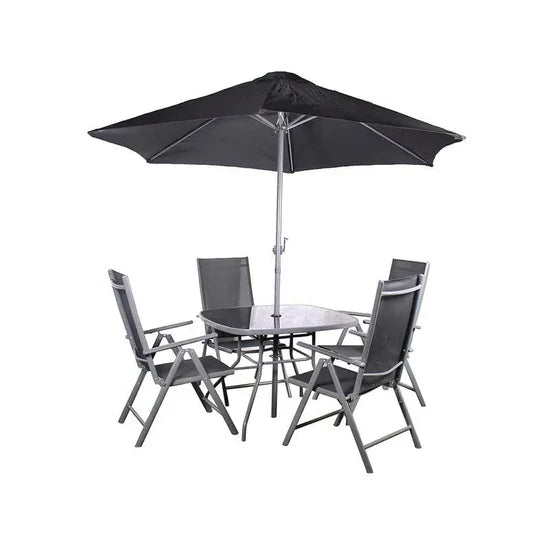 The Rio collection brings together style and practicality for your outdoor space. This four-seat garden set features a sturdy powder-coated steel frame in grey with high-grade textoline fabric in black—a durable, weather-resistant material that requires minimal upkeep. The modern design includes a square table with tempered safety glass, four reclining chairs that fold away for convenient storage, and a 2.4-meter parasol with black canopy for shade. Perfect for entertaining or relaxing, this complete set offers contemporary comfort without the maintenance hassle.