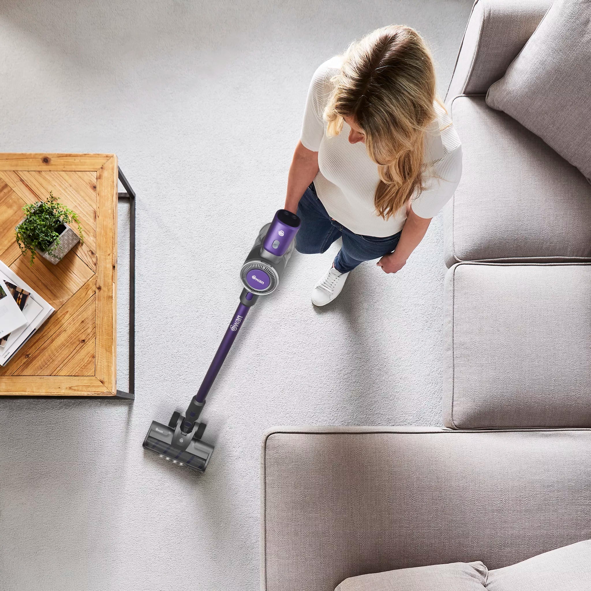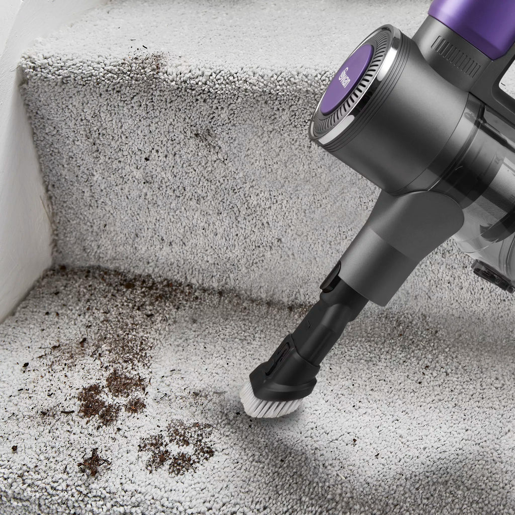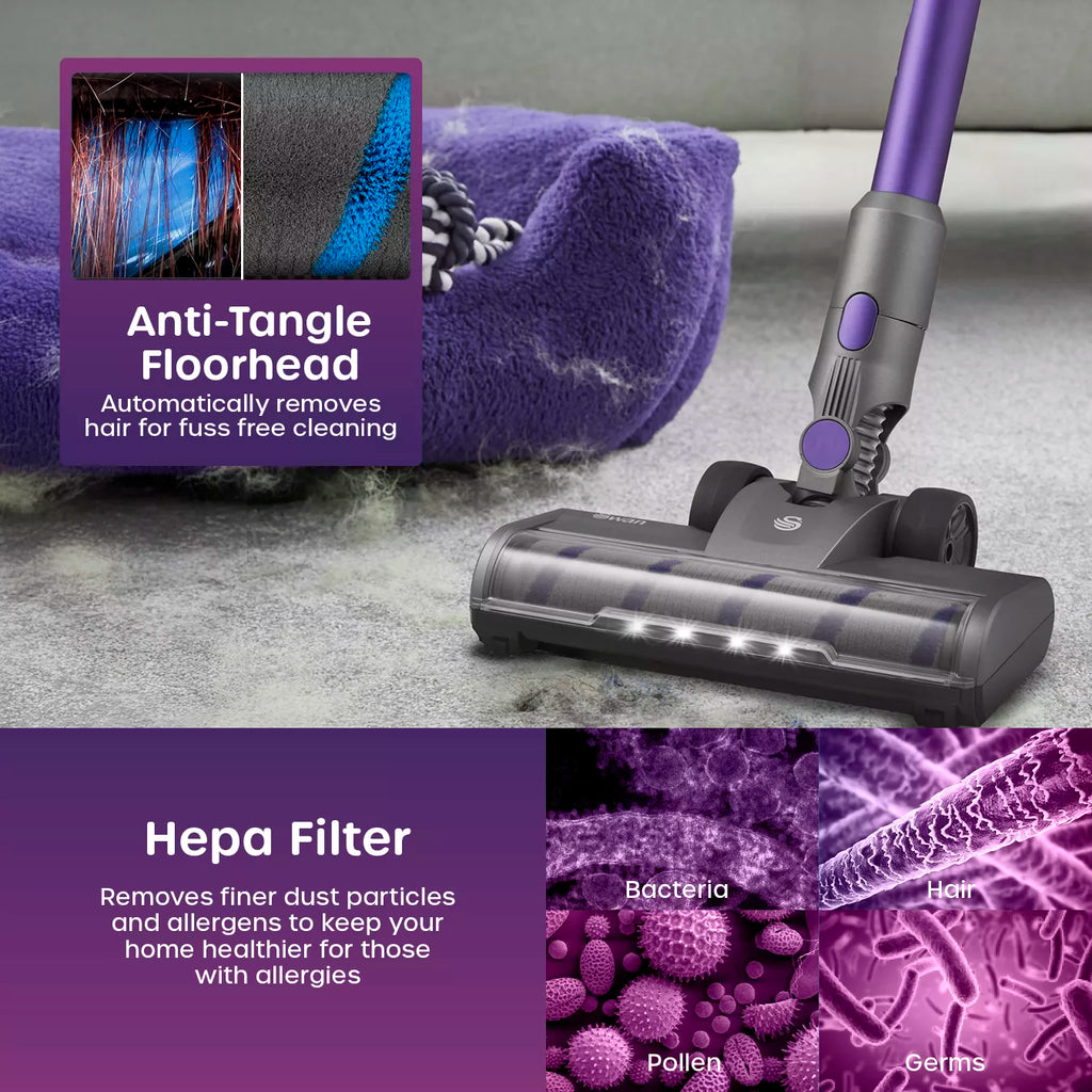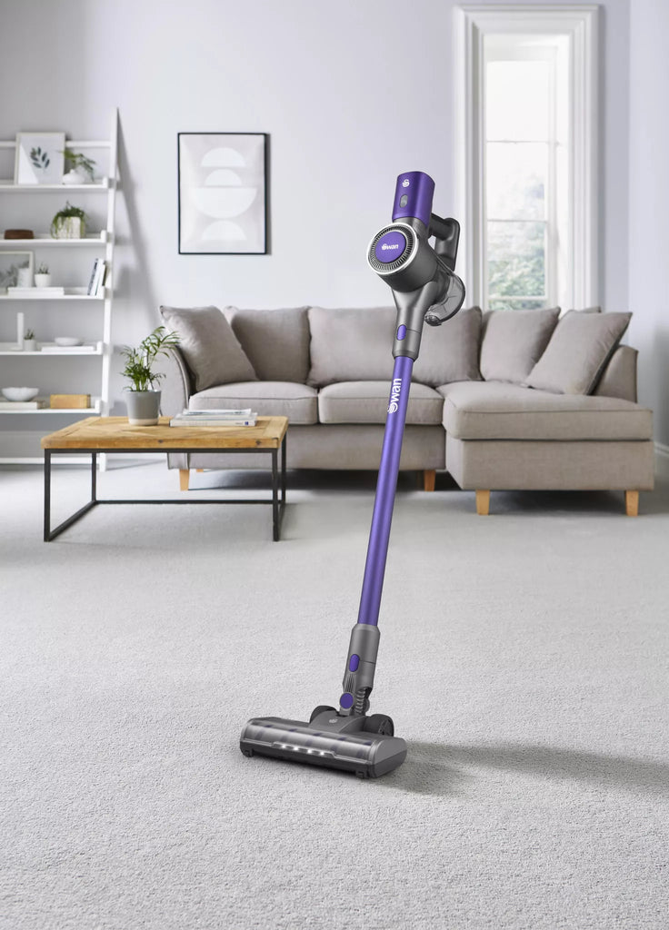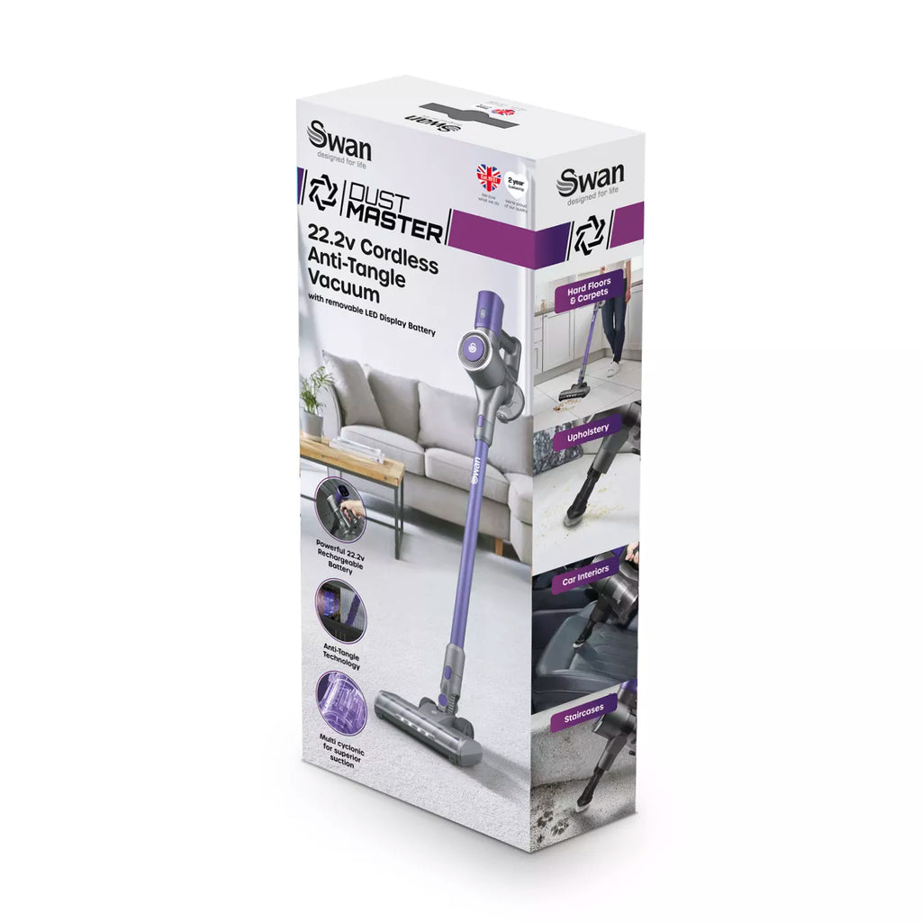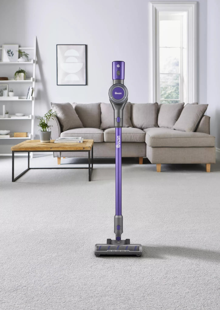 The Swan SC15827N cordless vacuum from our Dust Master range combines power and convenience for effortless cleaning. Its 22.2V lithium-ion battery and Multi-Cyclone DC motor deliver strong suction, with up to 35 minutes of runtime on a single charge. Choose between high power for stubborn dirt or an energy-efficient auto mode for extended cleaning. Lightweight and versatile, it easily converts to a handheld vacuum, while anti-tangle technology prevents hair blockages, ensuring smooth performance throughout your home. Also included is a 2-in-1 crevice tool and long nozzle for harder to reach areas. A wall mount kit is also available, so you can easily access the vacuum and save storage space in your cupboards. An LED light on the floorhead is great for cleaning up in low lit areas. That’s why this stick vacuum cleaner has the Lynsey Crombie crowning stamp of approval.