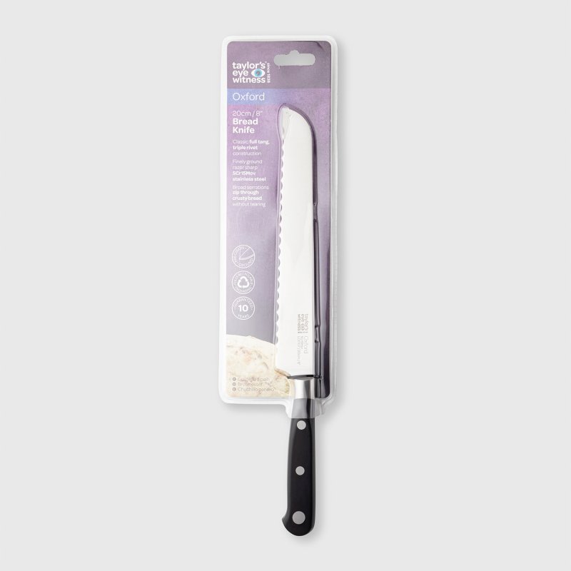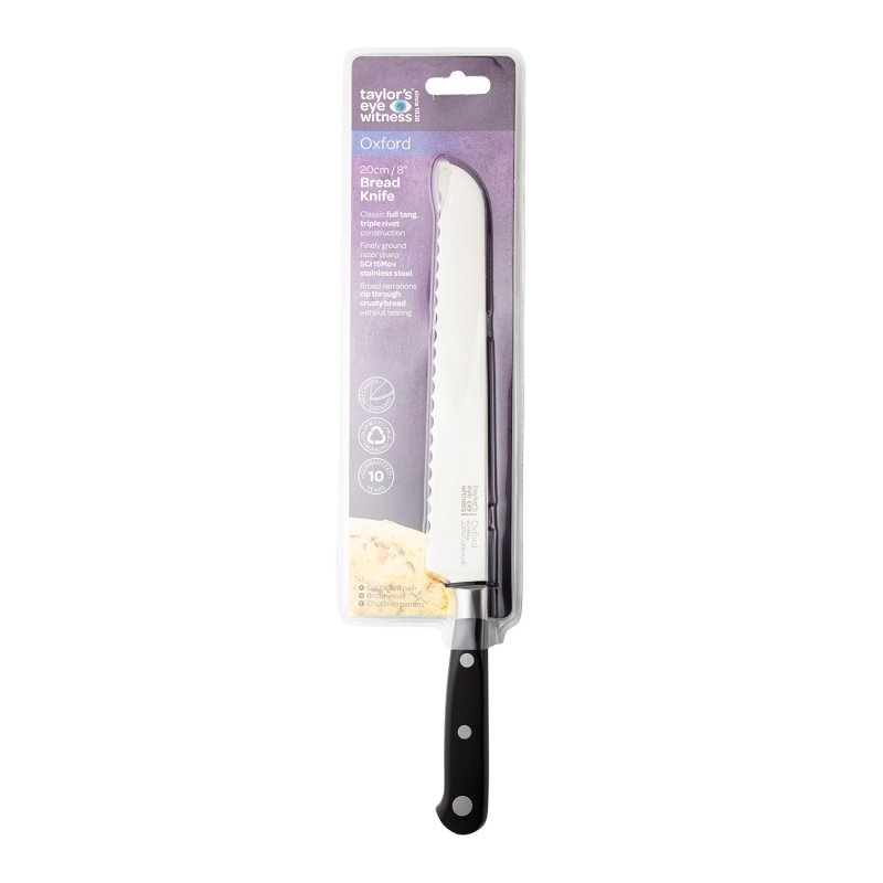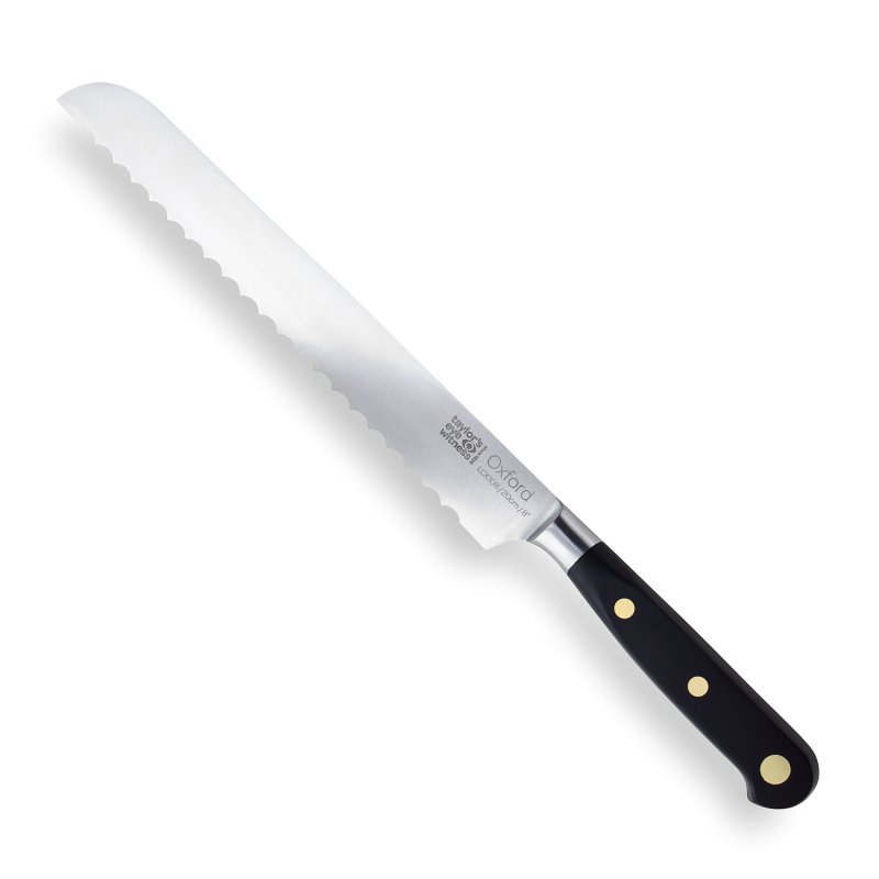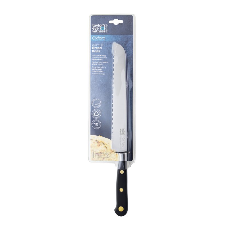 Slice through artisan loaves with confidence using this stainless steel bread knife. Its full-tang construction ensures superior balance and longevity, while three brass rivets provide authentic craftsmanship. The broad serrated edge glides effortlessly through crusty exteriors without crushing delicate crumbs. Classically designed and competitively priced, this knife delivers professional-grade performance for everyday kitchen use.