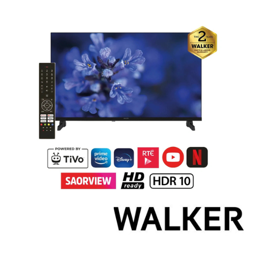 The Walker WPSBF32252BK 32" HD Ready Smart TV offers a perfect blend of compact size and smart functionality, making it ideal for any room. Enjoy seamless access to popular streaming services like Netflix, Disney+, and YouTube without additional fees, along with free Irish and UK channels via built-in Saorview and satellite tuners. The Full HD display delivers crisp, vivid images, enhancing your viewing experience beyond standard HD Ready screens. With easy navigation through the TiVo platform and a simple remote, this TV fits effortlessly into your home, whether wall-mounted or placed on legs.